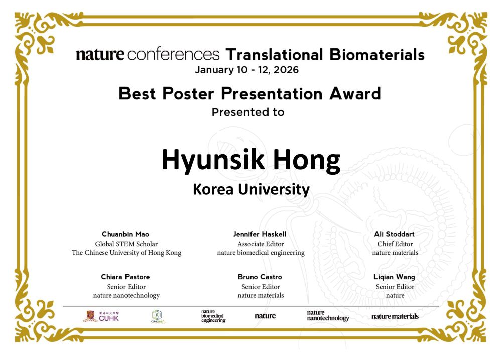 Hyunsik Hong received Best Poster Presentation Award at 2026 Nature Conference for Translational Biomaterials at CUHK, Hong Kong, China.