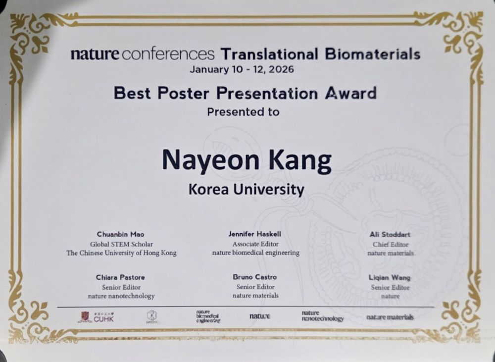 Nayeon Kang's Best Poster Presentation Award at 2026 Nature Conference for Translational Biomaterials 작성일 26-01-11 01:16